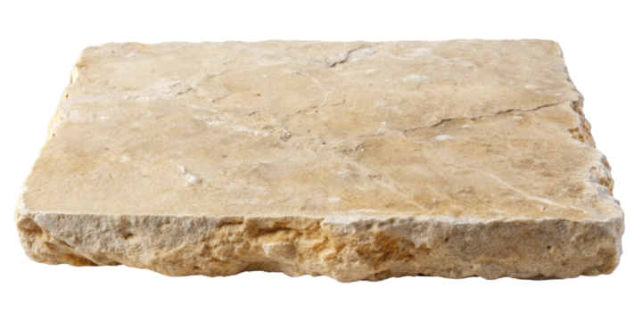 Flat beige stone tile with a rough surface, ideal for flooring or decorative use in landscaping and architectural designs. Isolated on transparent background, png.