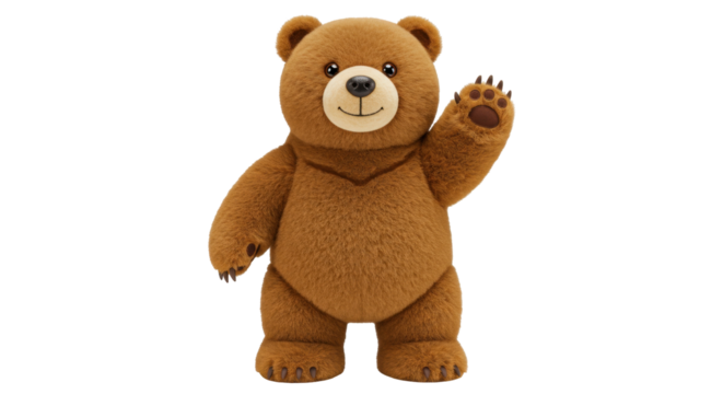 Cute brown teddy bear waving isolated PNG, fluffy stuffed animal toy for kids and decoration on transparent background
