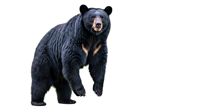 American black bear standing upright with front paws raised and curious expression, full body isolated on white background