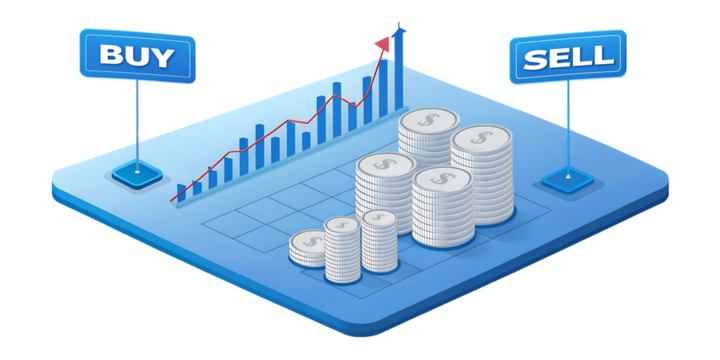 Financial growth concept displays a rising stock market chart, showcasing stacks of coins, accompanied by signs indicating buy and sell decisions on a transparent background.