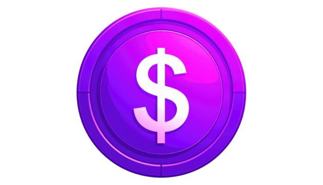 Purple coin with white dollar sign, shining in gradient light on black. Isolated