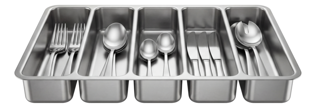 Heavy-duty stainless steel kitchen drawer organizer for commercial use.