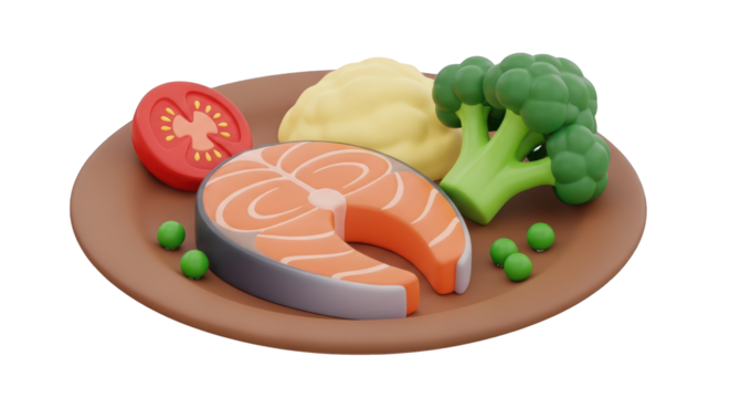 3D Cartoon Plate of Salmon Fish with Vegetables and Mash food meal isolated on a transparent background