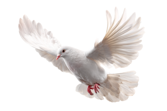 Dove PNG isolated on transparent background, white bird with open wings flying, symbol of peace and freedom, religious and spiritual concept