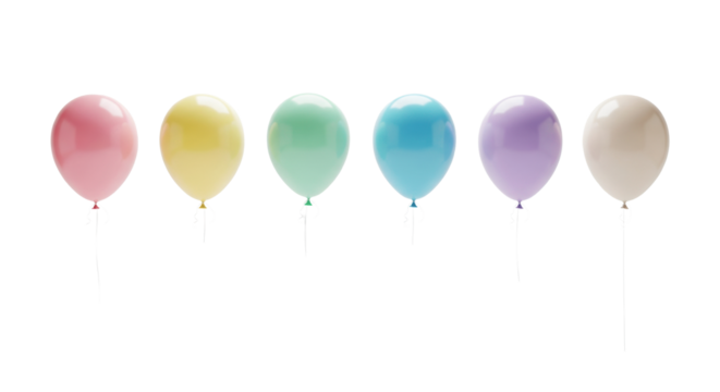 Seven perfectly aligned, glossy, ovoid helium balloons in a soft pastel rainbow palette floating against a bright white studio background with copy space. concept for elegant celebration banner