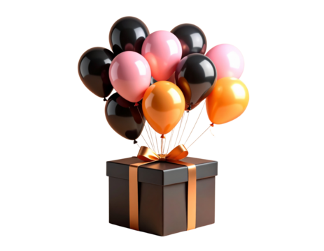 Floating Pink, Orange, and Black Balloons Tied to Dark Gift Box on Peach Surface.