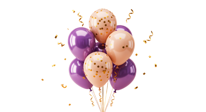 Purple and peach balloons with gold confetti and curly ribbons, festive decoration for celebrations and parties