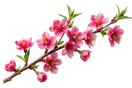 Peach tree branch adorned with pink flowers along the corner border, set on a transparent background