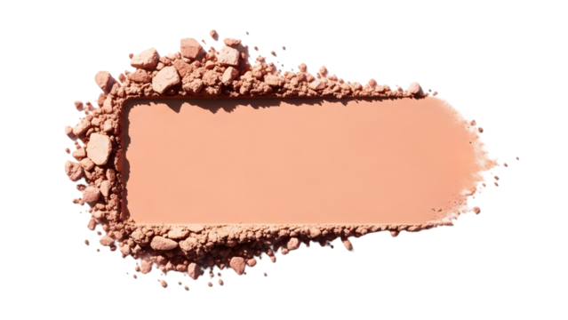 Makeup blush powder explosion. A makeup brush with a soft, fluffy head is positioned in a cloud of loose blush powder.