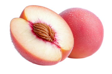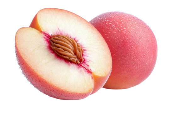 Whole and sliced peaches with pink liquid splash and green leaf isolated on a transparent background