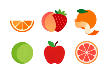 Fresh fruit set including peach, apple, pear, lemon, strawberry, cherry, watermelon, and orange isolated. Minimalist food icon collection.