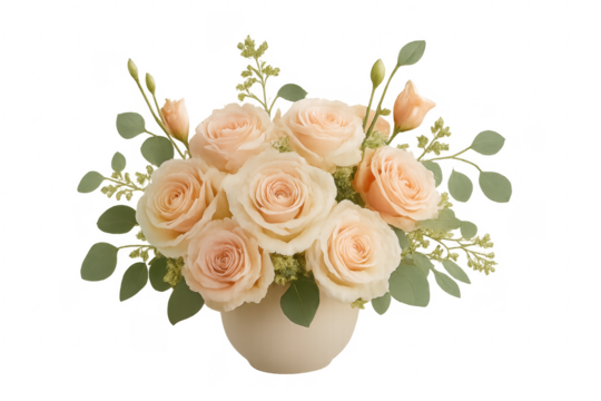 Floral bouquet featuring vibrant pink and red peonies with peach roses and eucalyptus leaves in a cream vase, transparent background