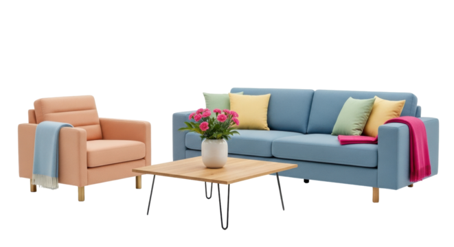Isolated living room furniture arrangement with modern sofa, chair, and wooden coffee table