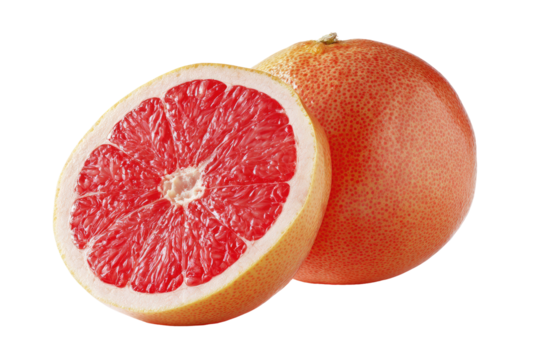 Two halves of a grapefruit, vibrant red inside, pale pink/peachy outside.  Close-up, studio shot, isolated against black