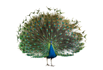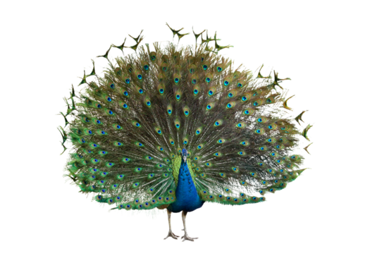 Close up photograph of a full body peacock with iridescent blue neck and green tail feathers isolated on a transparent background