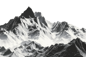 Rough textured mountain peak rises dramatically with distinct ridges and a small rocky base against a transparent background, showcasing its rugged formation.