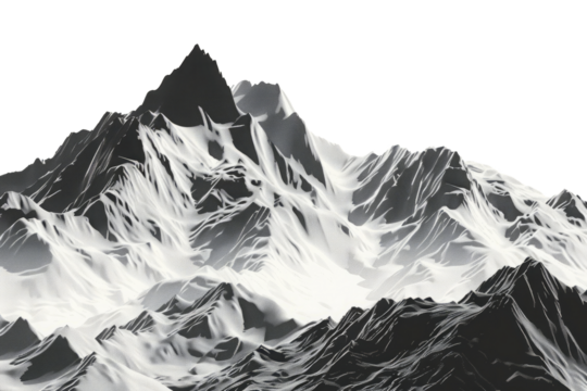 Illustration of snow-capped mountain peaks isolated on transparent background. Contrast rugged mountains. Hiking and outdoors traveling concept