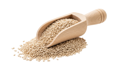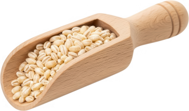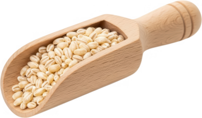 A small wooden scoop filled to the brim with natural pearled barley grains ready for cooking or baking purposes cereal raw whole grain food ingredient transparent background