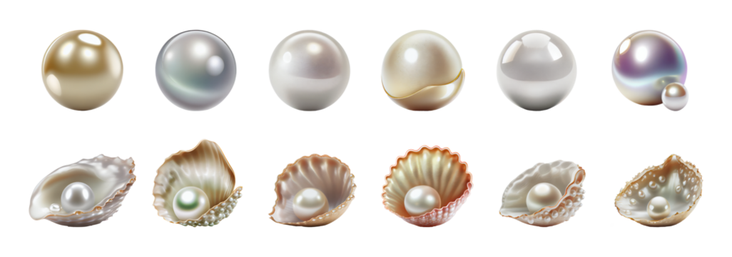Pearls and seashells collection. summer and vacation elements. Isolated on the transparent background.