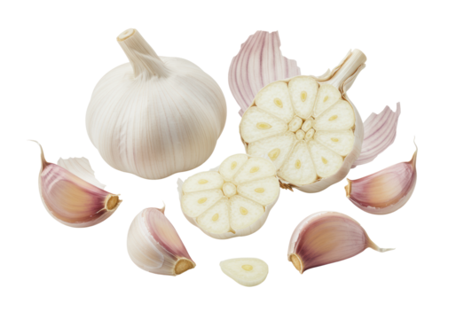 Fresh whole and half-cut garlic bulbs with scattered cloves, showing papery skin, pearly white cloves, and purple striations, on white background, sharp focus, purity and culinary potential concept