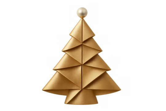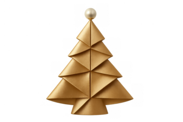 Golden origami christmas tree with a pearly white top, perfect for holiday decoration and festive design elements, on a transparent background
