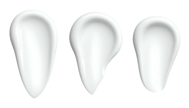 Three white cosmetic cream swatches, teardrop shapes, on a black background, with gloss