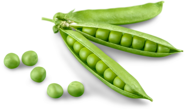 Whimsical cartoon pea pod with smiling peas on transparent background