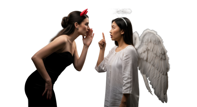 Young caucasian devil seductively whispers to shocked young asian angel on deep black background, dramatic low-key lighting, chiaroscuro, concept of moral dilemma and temptation