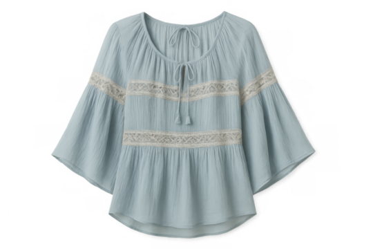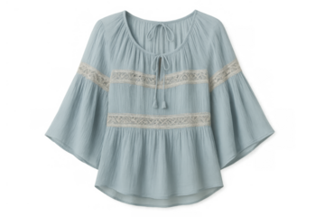 Light blue peasant blouse with lace detail and bell sleeves, women's fashion top cut out on transparent background