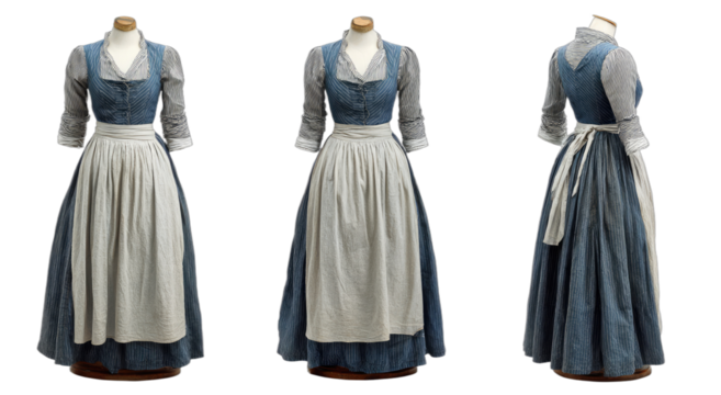 Historical dress ensemble featuring blue bodice, white apron, and layered skirt