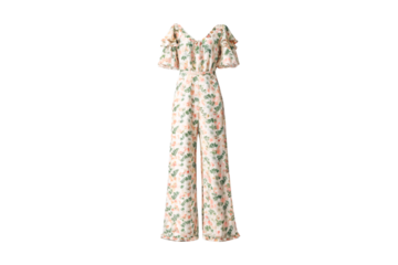 Floral jumpsuit with puffy sleeves, wide-leg pants, off-shoulder neckline, pink green botanical print, isolated on a transparent background
