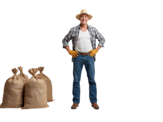 Proud farmer standing with hands on hips next to sacks on transparent isolated background