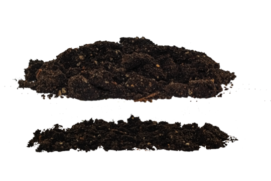 Close-up of dark brown soil pile with varied sizes and shapes creating depth and texture. Soil stands out on light gray background. No text or objects visible. Transparent isolated alpha mask.