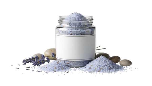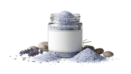 Glass jar filled with lavender bath salts surrounded by smooth stones and lavender sprigs on black background