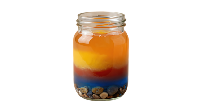 Colorful glass pebbles arranged inside a transparent jar reflecting natural light in a bright setting