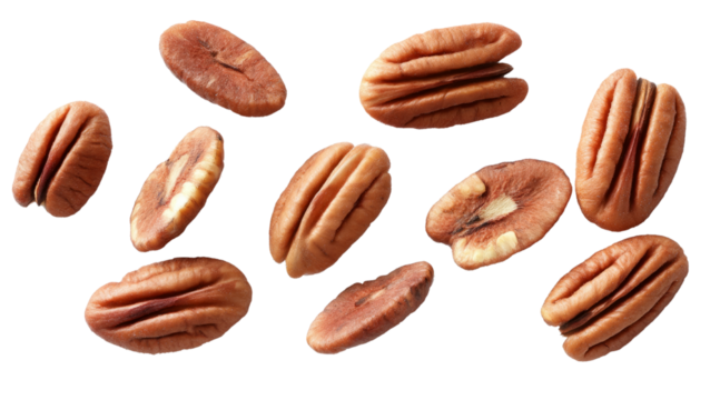 Pecan nuts floating isolated on a transparent background