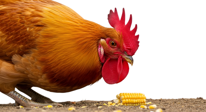 Hen pecking at feed: A close-up of a brown chicken foraging for grains against a crisp white backdrop showing barnyard behaviors and natural poultry