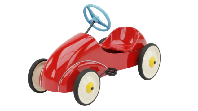 Isolated red pedal car toy with blue steering wheel, vintage plaything for kids, child