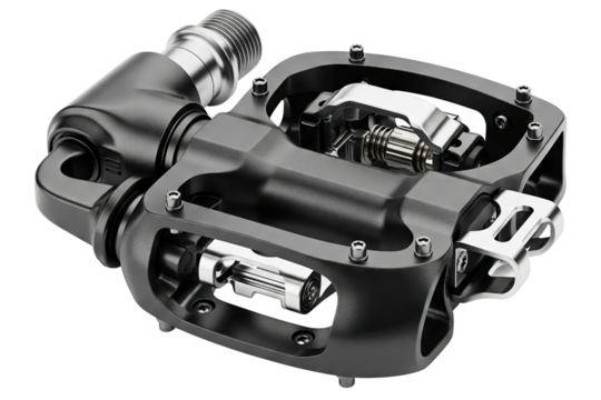Black metal bicycle pedal for outdoor cycling sports isolated on a transparent background