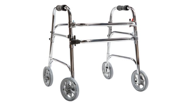 Heavy-duty chrome walker for bariatric patients, reinforced frame, dual front wheels, wide hand grips, non-skid tips, extra weight capacity, isolated on transparent background --ar 16:9 --s 250