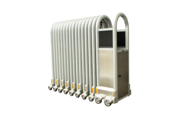Folding fence retractable fence on casters isolated on cut out PNG or transparent background Chrome aluminum barrier on casters. Sliding gates on rollers. Pedestrian barrier. Barricade Gate.