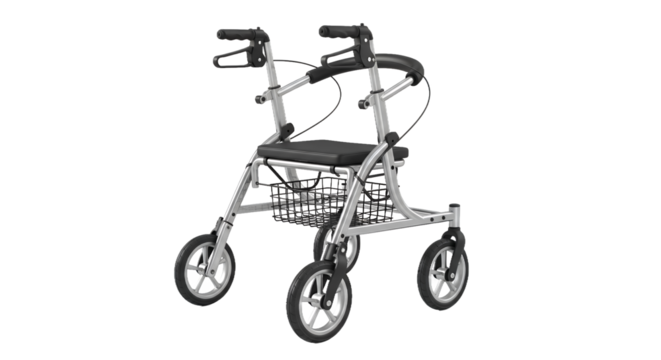 Silver Mobility Walker with Padded Seat and Four Wheels on a Clean White Background Offering Medical Support and Portable Design for Elderly and Disabled Individuals