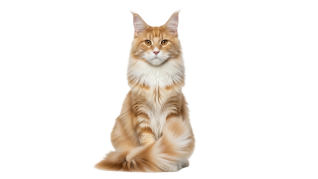 Isolated red tabby Maine Coon cat sitting up straight against a neutral backdrop studio shot