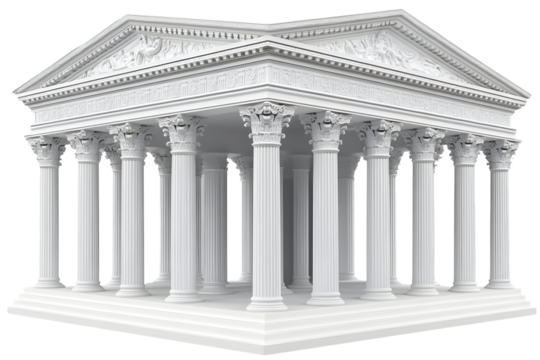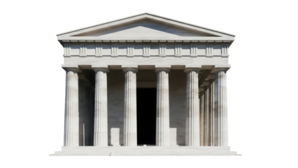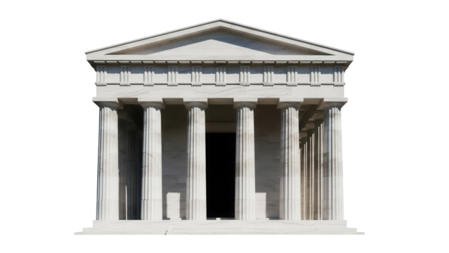 Classic Greek-style stone building with Corinthian columns and pediment, featuring intricately carved details on transparent background.