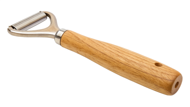 Wooden handled vegetable peeler isolated on transparent background, a kitchen tool for peeling potatoes, carrots, apples and other fruits