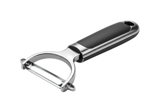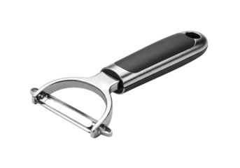 Stainless steel vegetable peeler with black handle isolated on transparent background