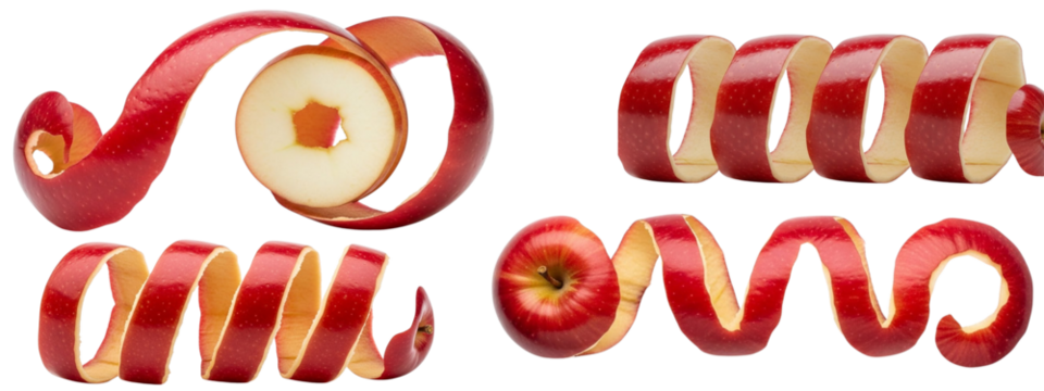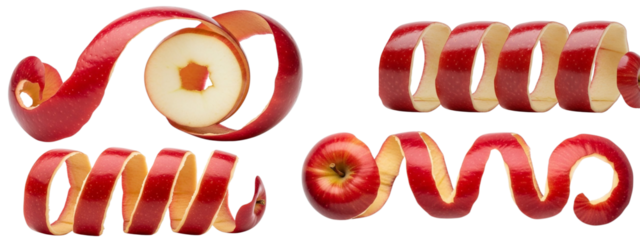 Curving, swirled pieces of red apple peel against a dark background. Fruit skin is twisted in abstract shapes