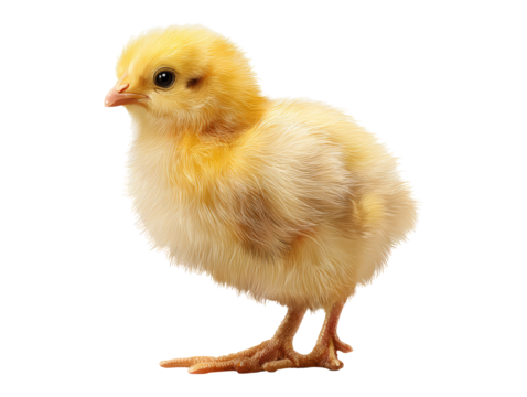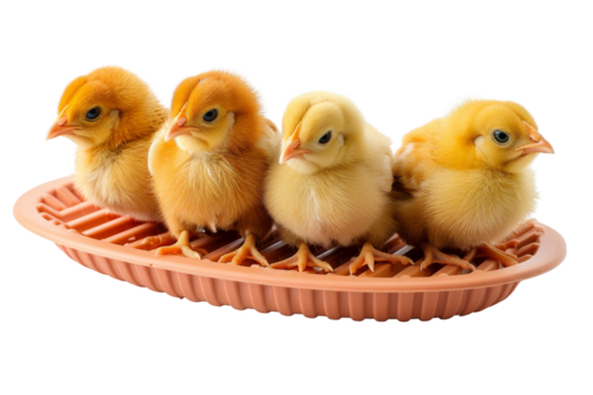 Four adorable yellow chicks sitting in an orange plastic container, displaying their fluffy feathers and curious expressions against a white background.