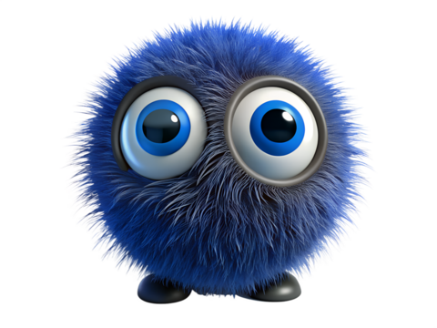 Cute blue furry monster with big eyes isolated on transparent background is looking at the viewer curiously