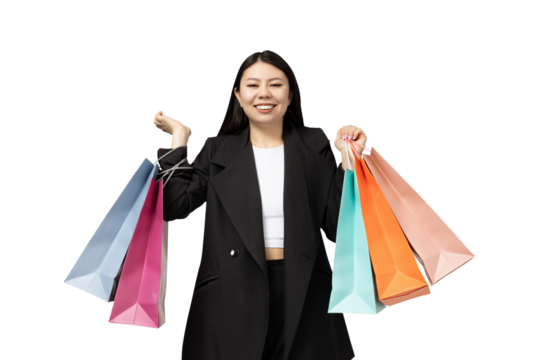 PNG Asian girl with shopping bags isolated on white background.